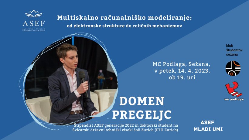 Ameriško-slovenska izobraževalna fundacija (ASEF) v sodelovanju z MC Podlaga in Klubom študentov Sežana organizira poljudnoznanstveno predavanje, ki ga bo v petek, 14. aprila, ob 19. uri izvedel Domen Pregeljc, štipendist ASEF generacije 2022 in doktorski študent na Švicarski državni tehniški visoki šoli Zurich (ETH Zurich). Predavanje nosi naslov “Multiskalno računalniško modeliranje: od elektronske strukture do celičnih mehanizmov” in bo potekalo v prostorih MC Podlaga.