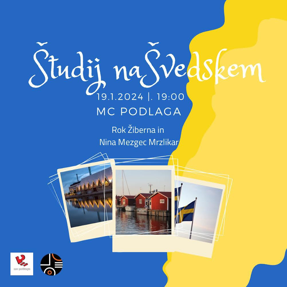 V petek, 19. 1., se nam ob 19.00 pridruži v MC Podlaga, kjer bosta Rok Žiberna in Nina Mezgec Mrzlikar povedala nekaj o tem, kako lahko študij v tujini popestri tvojo študentsko izkušnjo. Prisluhni švedskim akademskim pustolovščinam iz prve roke, spoznaj študijsko okolje in pridobi kakšen nov nasvet.